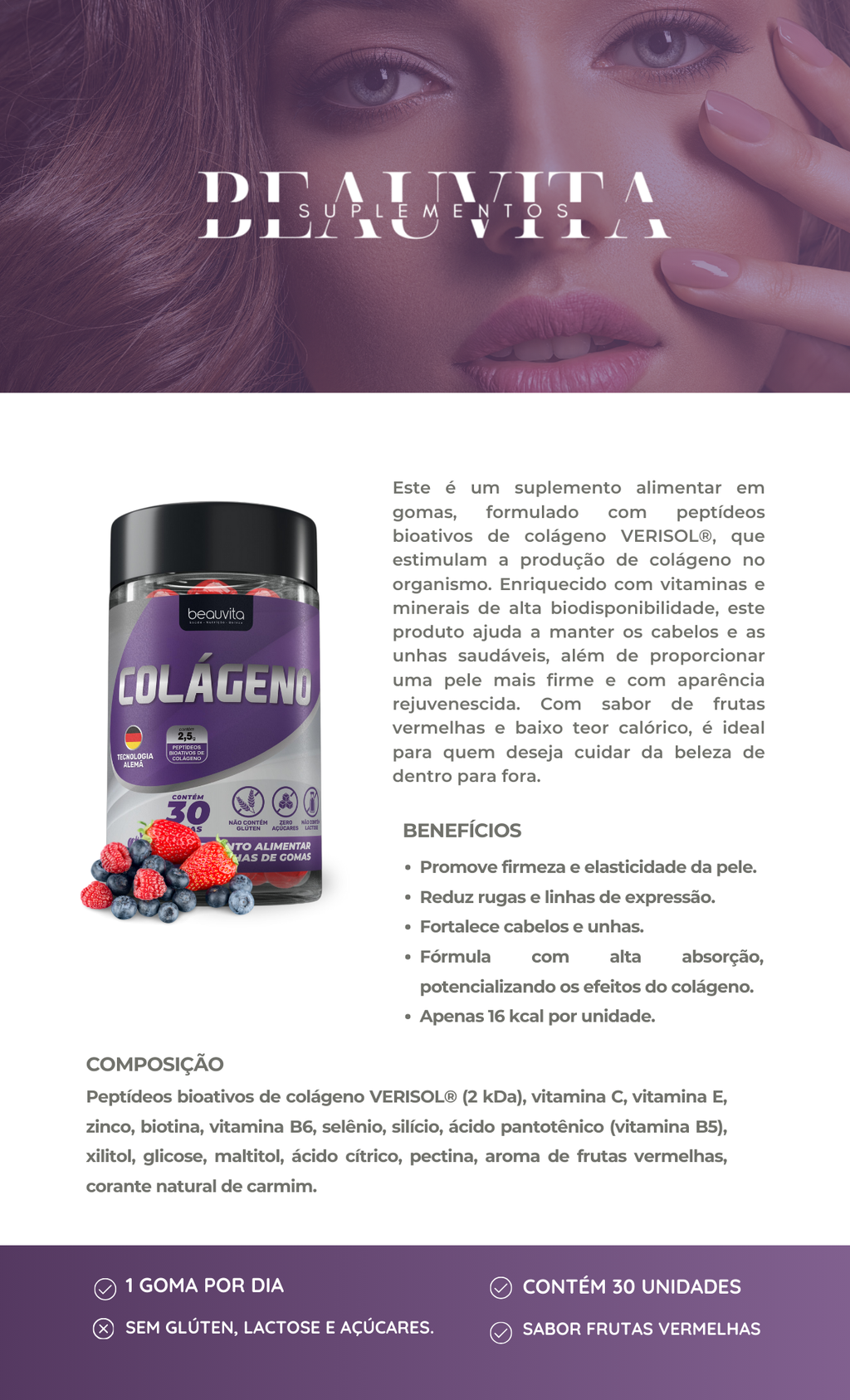 Colágeno Gummies é um suplemento alimentar (em gomas, balas macias) à base de peptideos bicativos de colágeno VERISOL para pele, unhas e cabelos, com excelente absorção no organismo, enriquecido com vitaminas e minerais quelados que por terem alta biodisponibilidade, potencializam os efeitos do colágeno Sabor frutas vermelhas, com baixa caloria (16 kcal/unidade).