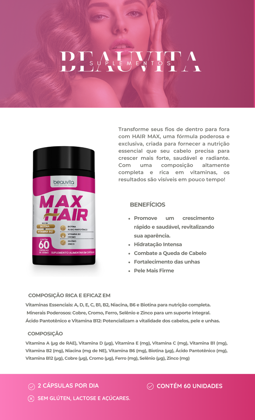 Transforme seus fios de dentro para fora com HAIR MAX, uma fórmula poderosa e exclusiva, criada para fornecer a nutrição essencial que seu cabelo precisa para crescer mais forte, saudável e radiante. Com uma composição altamente completa e rica em vitaminas, os resultados são visíveis em pouco tempo!